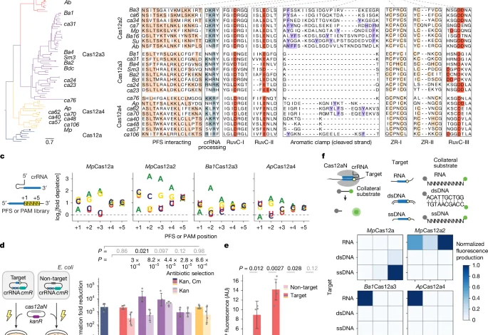 Preference for targets and cleavage substrates was evaluated in vitro using nucleases purified as described above. Reactions contained 500 nM of the respective nuclease, an equimolar amount of T19 GAPDH non-target crRNA and T17 GAPDH target crRNA, and T17 GAPDH target at 50 nM provided either as RNA, ssDNA or dsDNA, as well as respective non-target substrates at 1 µM (Supplementary Table 2). For assays with Ba1Cas12a3 Y922A and ΔtRLD (Supplementary Fig. 13), reactions contained 100 nM nuclease, crRNA and target RNA together with 5 µM RNA substrate library. Reactions were performed in a buffer comprising 40 mM Tris-HCl (pH 7.5), 50 mM NaCl and 1 mM DTT, with MgCl2 at 2 mM for Cas12a2, Cas12a3 and Cas12a4 nucleases and 10 mM for Cas12a. Fluorescence, indicative of reporter cleavage via separation of the fluorophore and quencher, was monitored at 29 °C on a BioTek Synergy H1 plate reader (excitation of 492 nm, emission of 520 nm). For the heatmap in Fig. 1f, initial reaction rates in the linear range were normalized for each nuclease by setting the highest rate across reporters to one. All experiments were performed in at least three biological replicates.